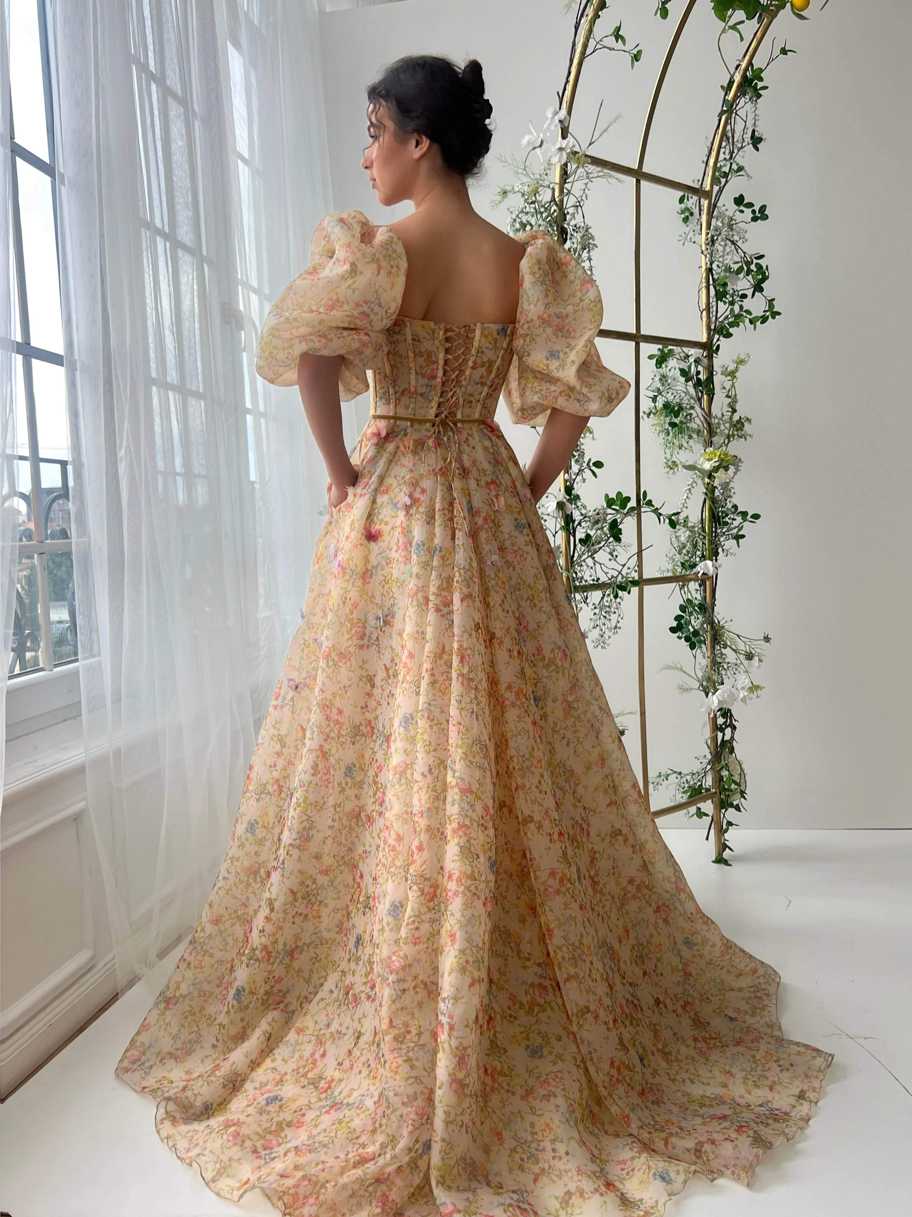 This floral organza gown is detailed with embroidered butterflies, a structured bustier bodice, and soft balloon sleeves. A delicate waist tie, laced-up back, and flowing A-line skirt with inseam pockets complete the design—ideal for garden weddings and outdoor celebrations.