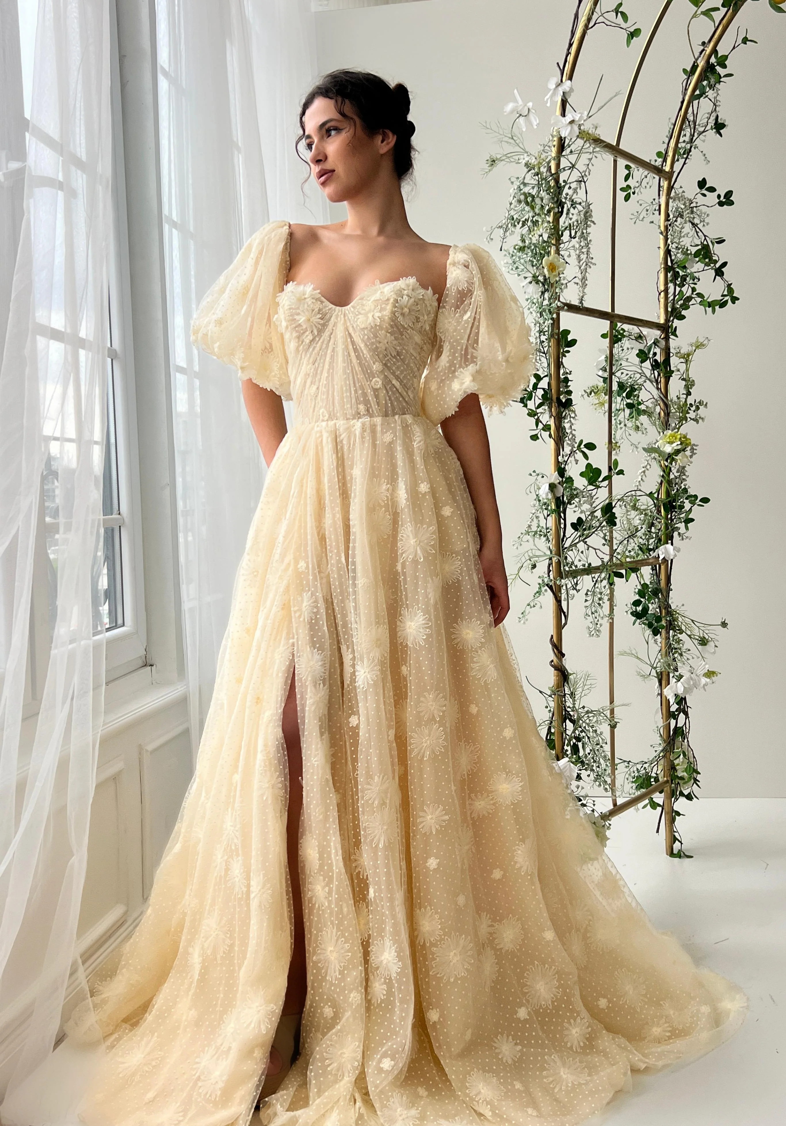 Softly embroidered with delicate florals over dotted beige tulle, this gown features a structured bodice with 3D accents, a high leg slit, and inseam pockets for subtle ease. The laced-up back adds a romantic finish, while two sleeve options—tied straps or puffed sleeves—offer styling versatility for weddings, garden parties, and elegant outdoor occasions.