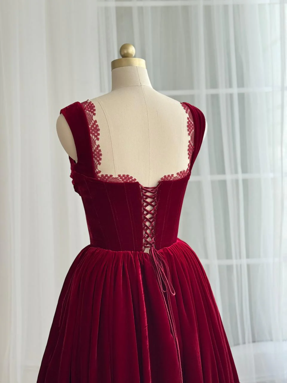 Crafted from rich cherry red velvet, this midi dress captures vintage-inspired charm with a modern romantic touch. The structured bustier bodice features a sweetheart neckline framed by delicate lace trim, while the fitted waist accentuates the figure before flowing into a full gathered skirt that moves gracefully with every step. A lace-up back ensures an adjustable fit and adds a refined finish, making this dress a perfect choice for festive gatherings, romantic dinners, and winter celebrations.