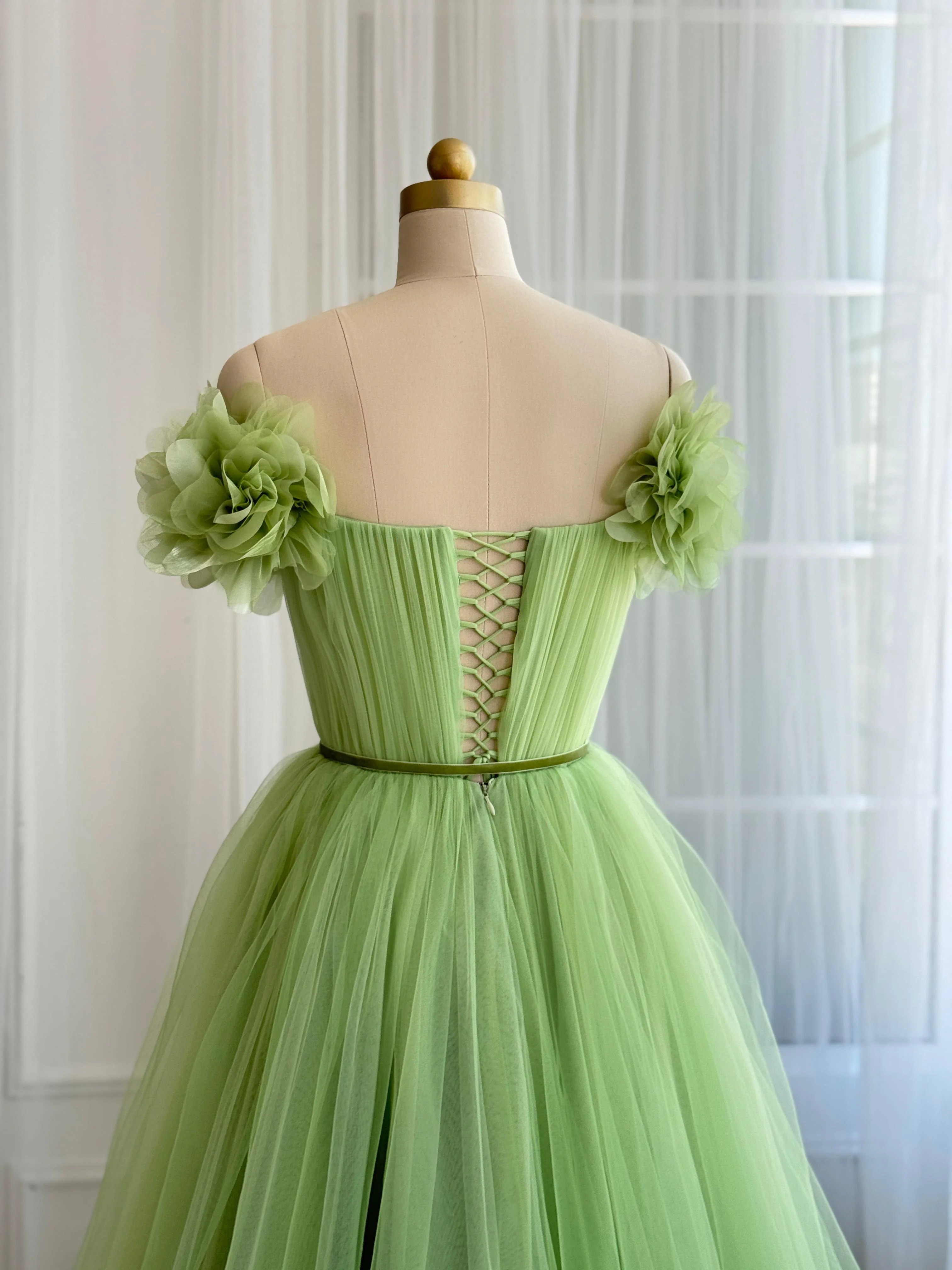 This soft green gown is designed in airy layers of tulle, showcasing an off-shoulder neckline adorned with oversized floral appliqués and a gently pleated bodice. A slim ribbon tie defines the waist, while the flowing A-line skirt and laced-up back create a romantic finish, perfect for weddings, galas, and special celebrations.