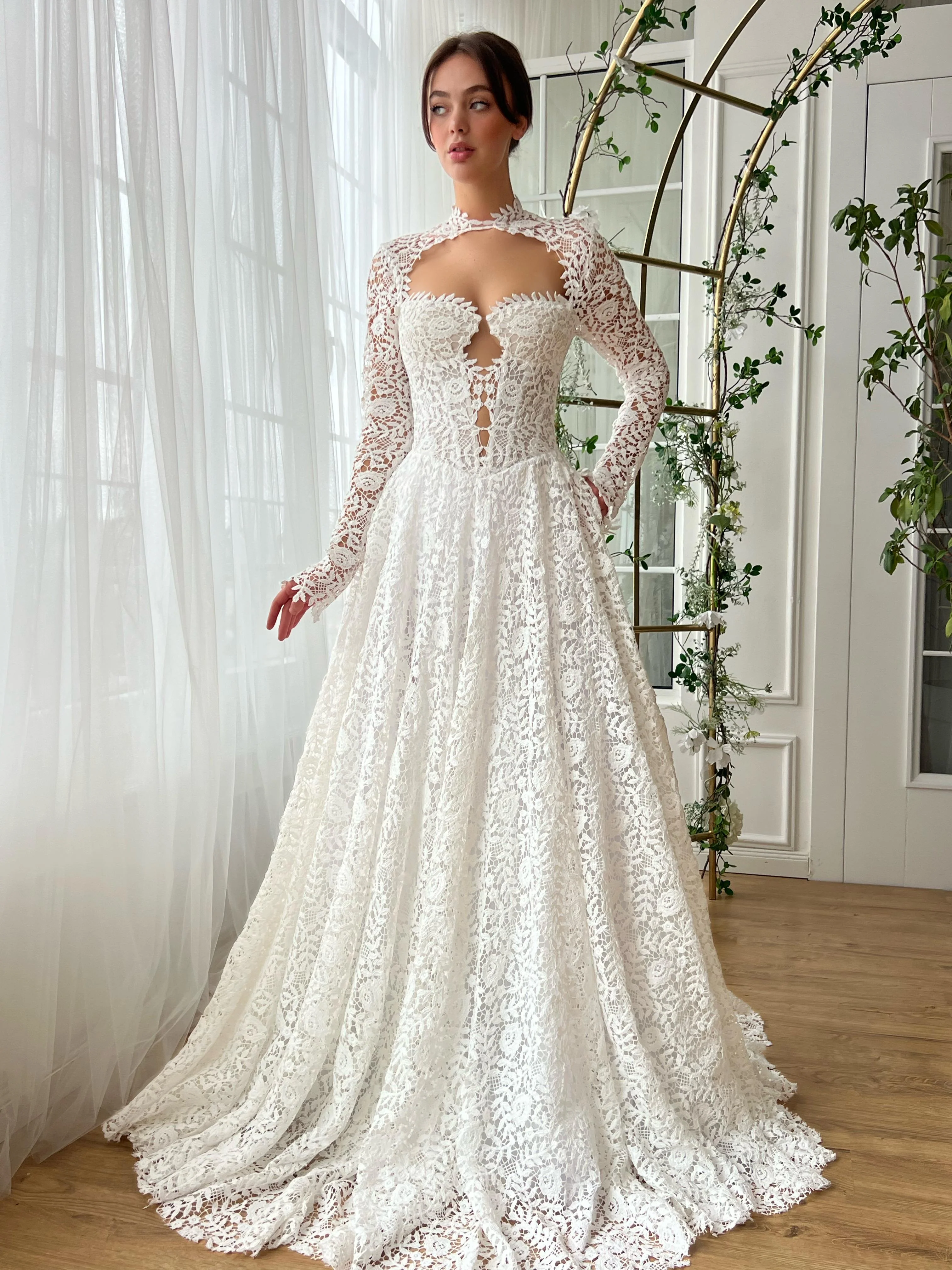 Crafted from delicate floral lace, this gown blends classic romance with modern sophistication. The structured bustier corset and cinched waist create a flattering silhouette, while the button-up front and high-neck lace collar add a refined touch. Long fitted sleeves and a flowing A-line skirt with a scalloped lace hem enhance its timeless appeal. Finished with a laced-up back for an adjustable fit, this gown is a stunning choice for weddings, formal occasions, and gala events.
