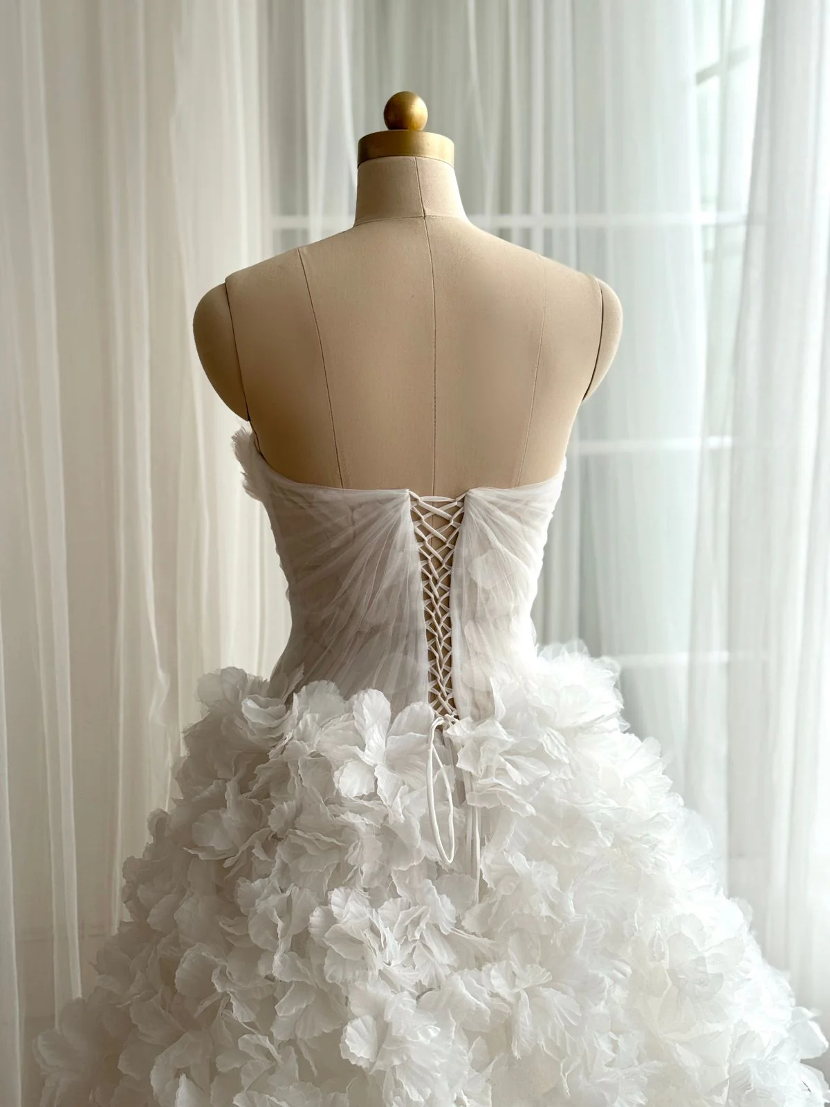 This white bridal gown embodies romance with its strapless sweetheart neckline and delicately pleated tulle bodice that contours the figure with graceful structure. The voluminous skirt is covered in cascading hand-crafted floral appliqués, creating soft texture and movement. Finished with a laced-up back for a secure, tailored fit, this gown is a modern fairytale piece designed for brides who want to blend sculptural detail with ethereal charm.