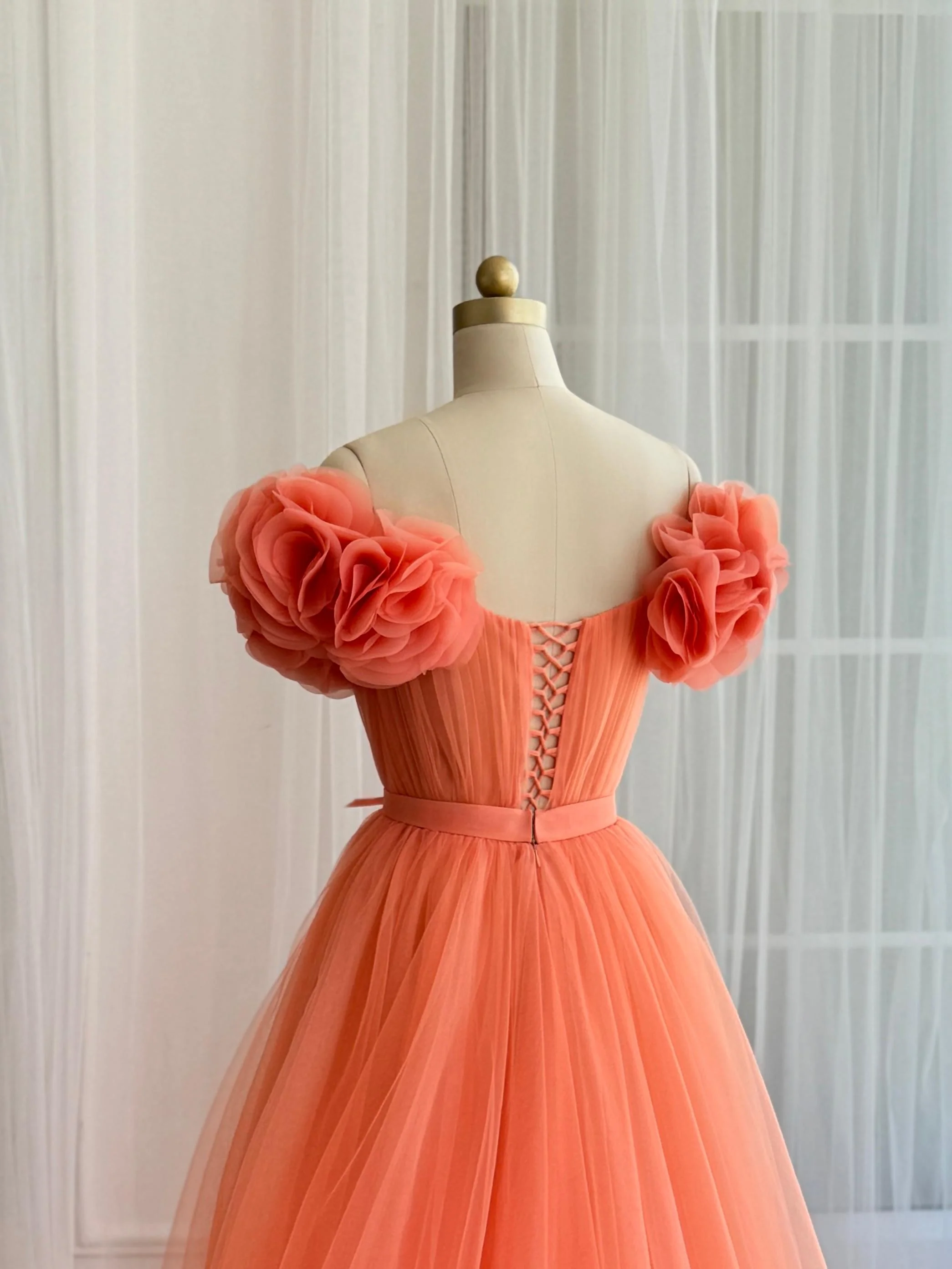 This peachy orange gown is crafted from airy layers of tulle, featuring an off-shoulder neckline adorned with oversized floral appliqués and a softly pleated bodice. Finished with a dainty ribbon tie at the waist and a laced-up back, its flowing A-line skirt makes it a striking choice for weddings, galas, and special occasions.