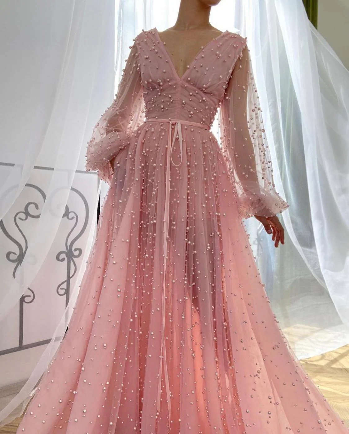 Sparkle, fizz, clink. The Pink Mimosa Beaded Gown is a shimmering dresses covered in a sea of thousands of pearly pink beads. Deep v-neck with ruched waist and A-line silhouette. Sheer sleeves. Finished with a small velvet sash.