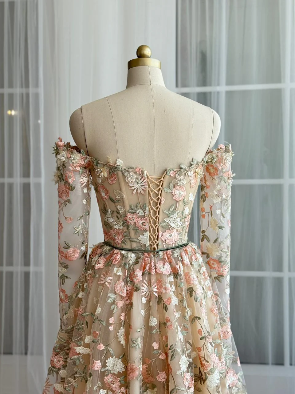 A romantic blush-toned gown featuring delicate 3D floral appliqués cascading over sheer tulle. The off-shoulder corset bodice and long embroidered sleeves create a refined, feminine look, while the flowing skirt adds graceful movement. Finished with a laced-up back for a customizable fit, this gown is made for weddings, receptions, or any event that calls for soft, floral charm.