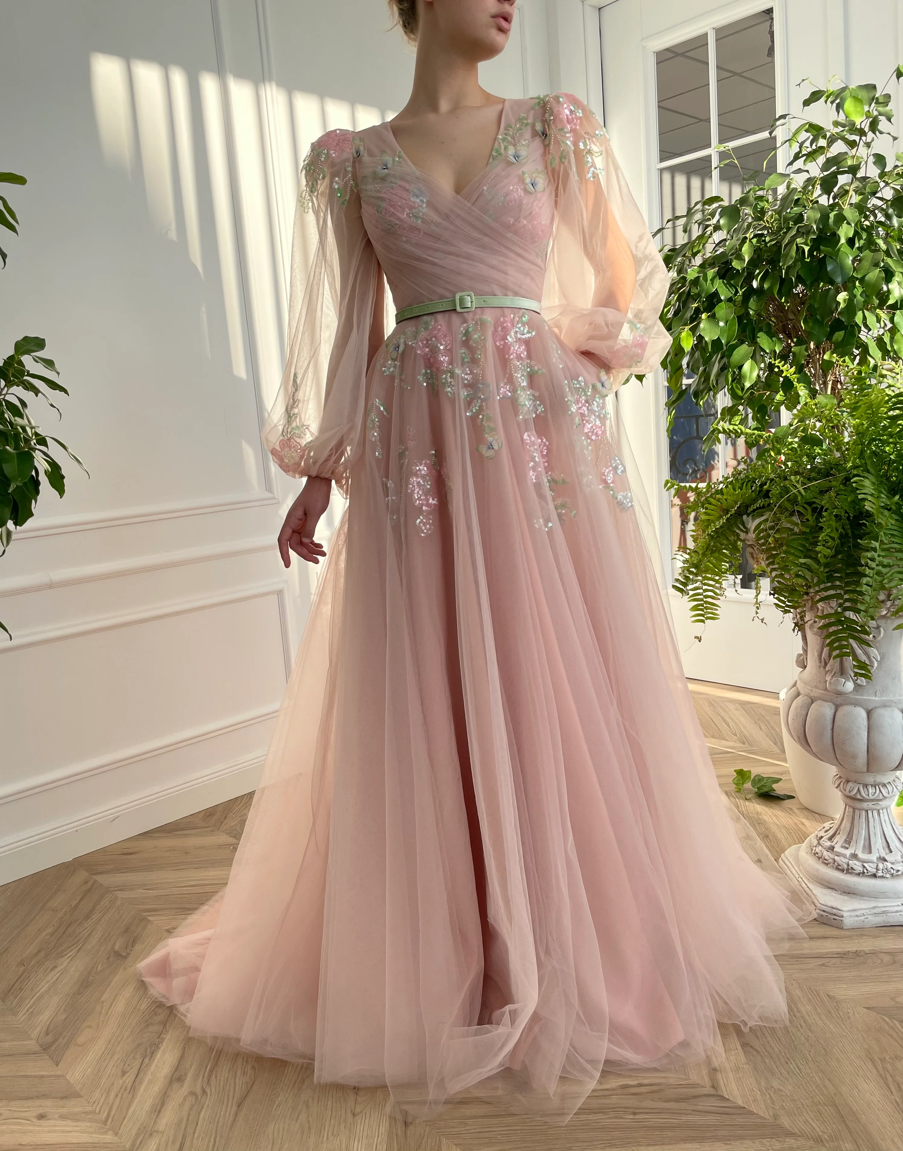 -Primrose tulle with pastel pink flowers and green leaves embroidery
