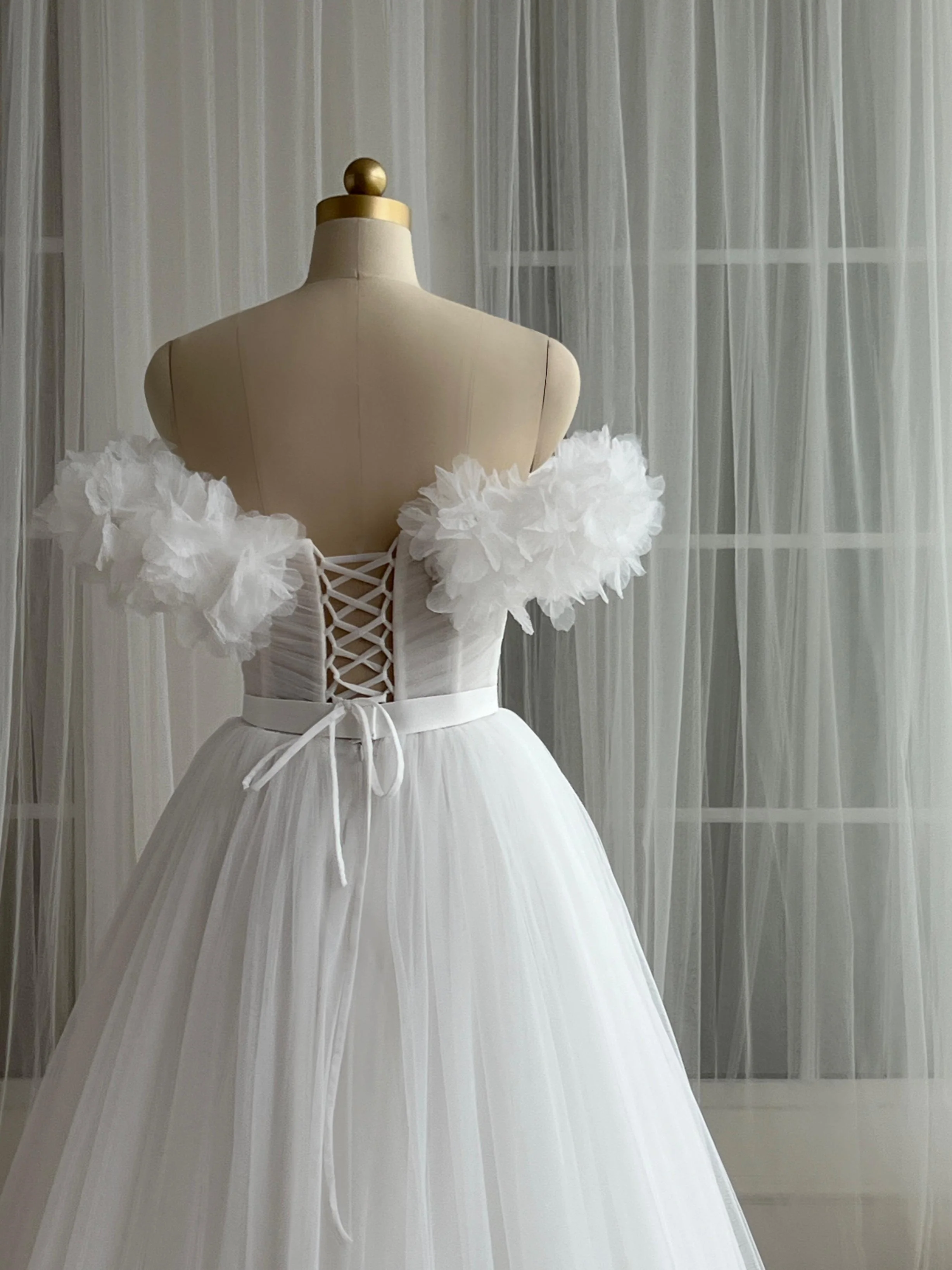 A vision in white, this off-shoulder gown features a structured bustier bodice with delicate boning and a cinched satin waist, flowing into a full A-line skirt of layered tulle. Voluminous ruffles grace the neckline, mirrored by 3D floral appliqués blooming along the hem. Finished with a romantic laced-up back, this gown is perfect for weddings, receptions, or any moment worth remembering.