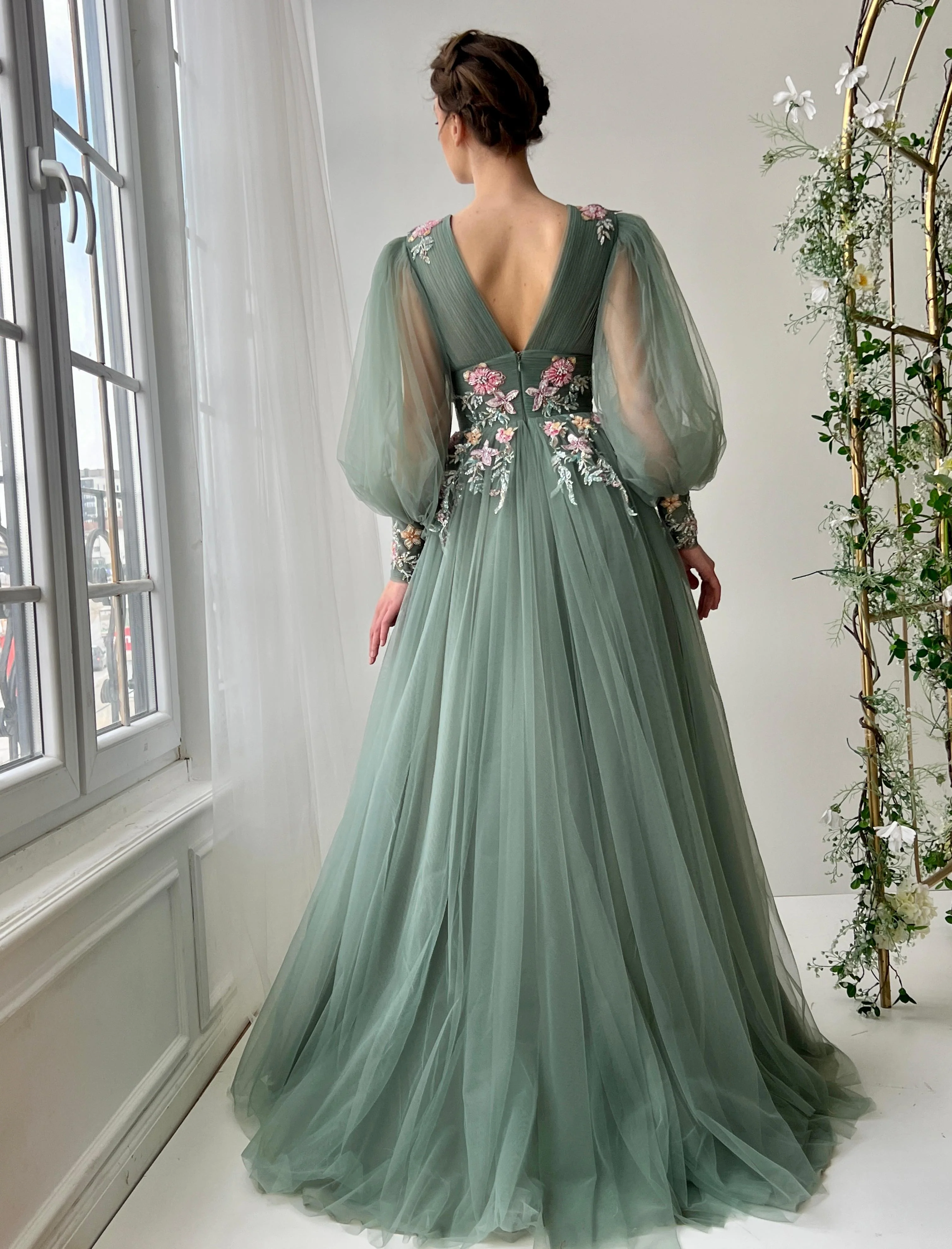 This sage green gown pairs delicate embroidered tulle with soft 3D floral accents, creating a romantic look ideal for formal celebrations. The deep V neckline and fitted bodice highlight the waist, while voluminous bishop sleeves and a flowing skirt add graceful movement. Finished with floral cuffs and a discreet zippered back, it's a refined choice for garden weddings, receptions, and memorable occasions.