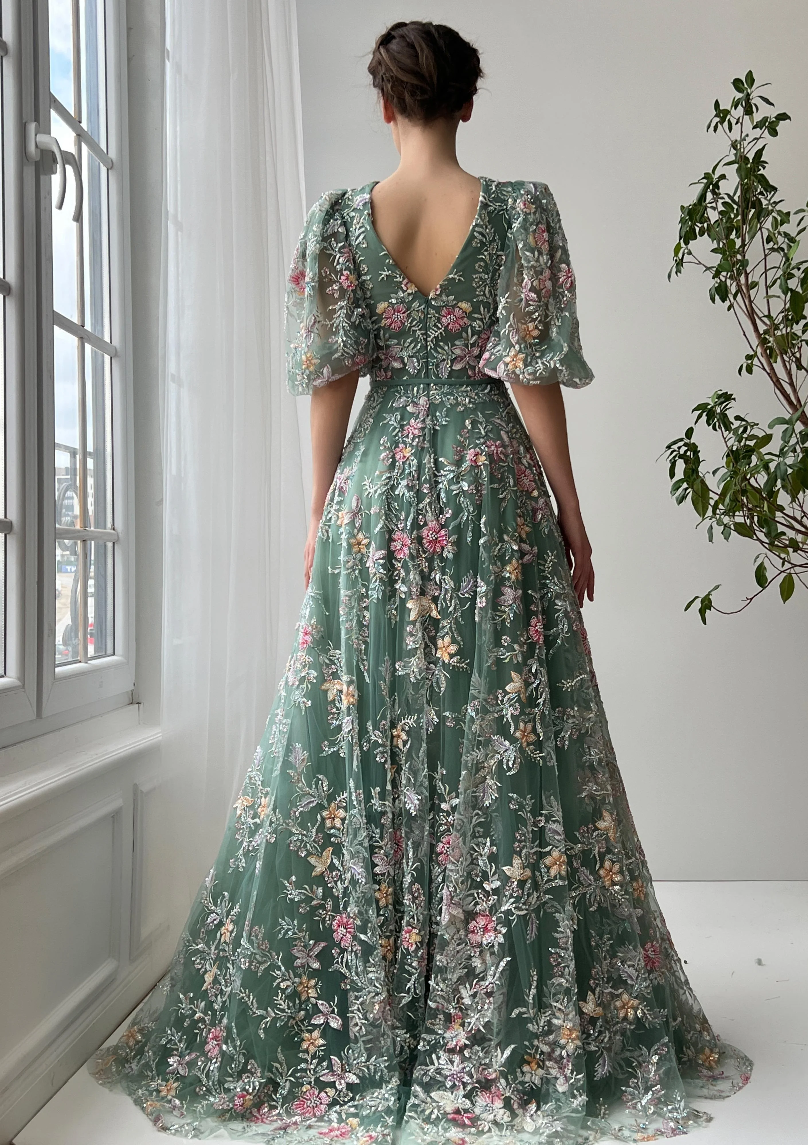 Intricately embroidered with blooming florals, this dusty sage green gown captures the charm of a spring garden in full bloom. The plunging illusion neckline and puffed elbow-length sleeves lend a romantic silhouette, while a soft waist tie and hidden pockets add both elegance and ease. Finished with a flowing A-line skirt and a zippered back, it’s a graceful choice for outdoor weddings, special occasions, and seasonal soirées.