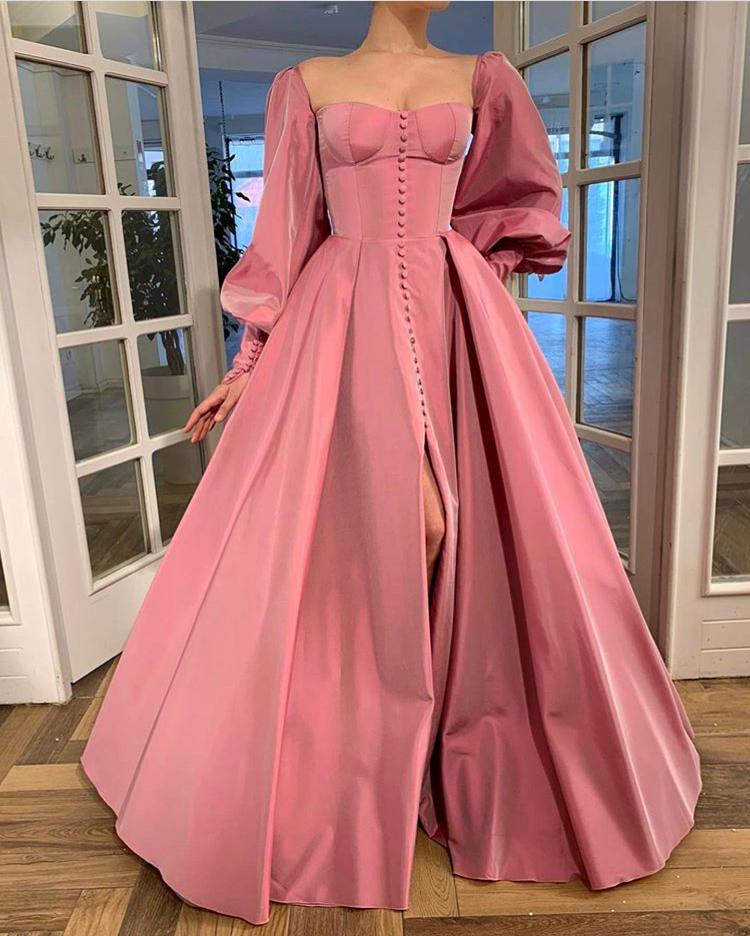 Get lost in wonder in a fragrant hanging rose garden. The Timeless Rose Gown evokes glamour and romance from another time, made in taffeta fabric in a beautiful, pearlescent rose hue. Features long puffed sleeves, bustier style bodice and delicate buttons. Open at the thigh.