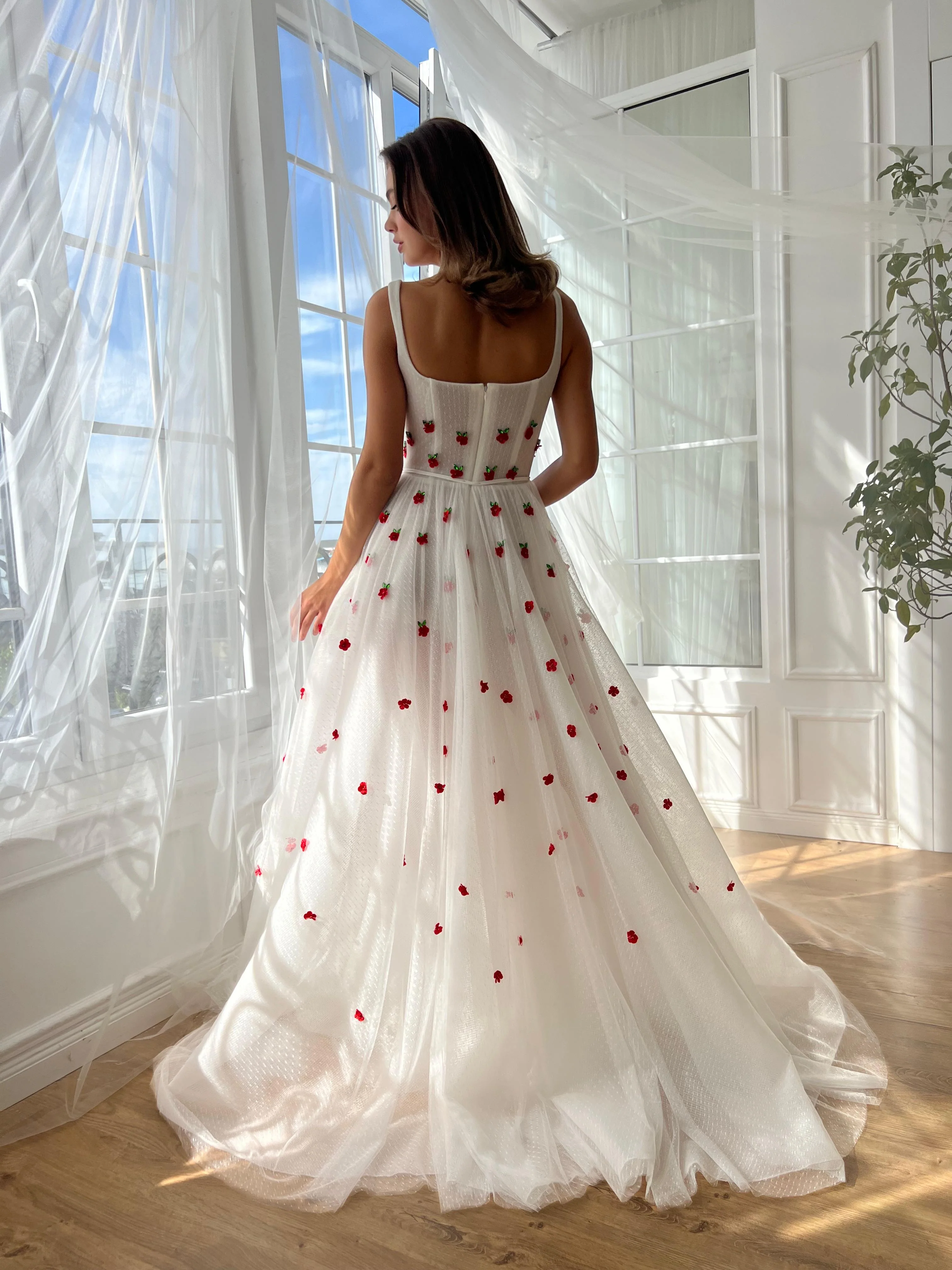 This dress features a soft white base with playful rose embroidery, giving it a fresh and fun look. Made from lightweight tulle fabric, it has a square neckline with thin shoulder straps, a fitted bodice with gentle support, and a waist cinched with an adjustable drawstring. The flowing A-line skirt includes a high leg slit for easy movement, and the zippered back ensures a secure fit. Perfect for summer events, garden parties, or any special occasion, this dress is both stylish and easy to wear.