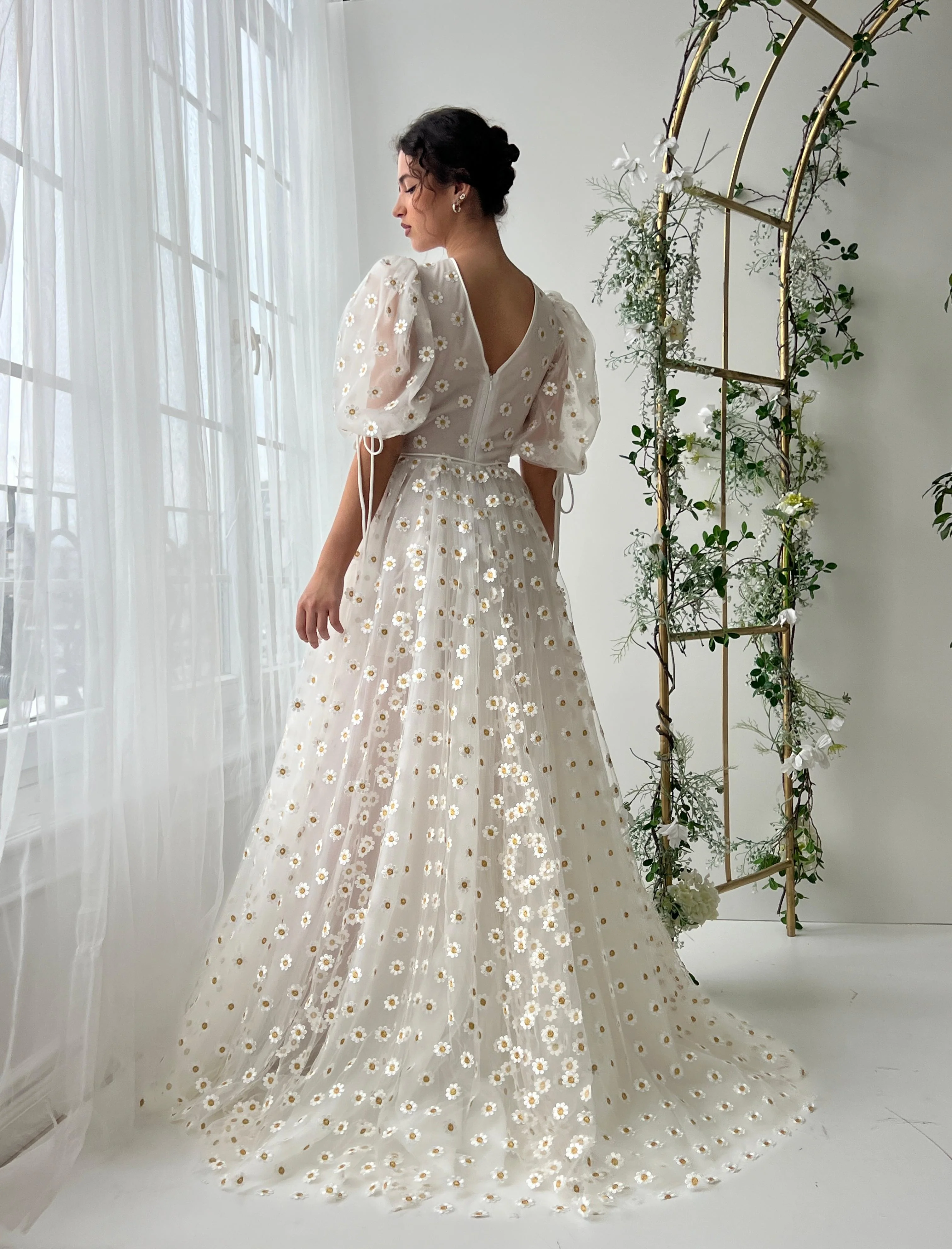 A dreamy blend of charm and whimsy, this ivory tulle gown is embroidered with delicate daisies from bodice to hem. The deep V neckline is softened by a sheer illusion panel, while puff sleeves and a gathered waist with tie detail add a romantic touch. Finished with a flowing A-line skirt and zippered back, it’s an effortless choice for garden weddings, bridal showers, or any celebration under the sun.